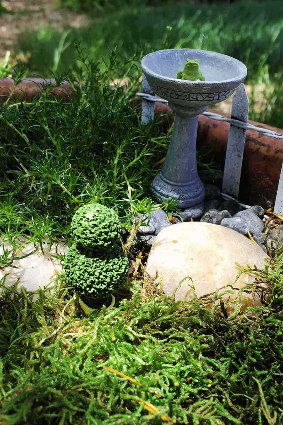 Get creative! In the beginning I had a painted bird house for the main hut, wooden spools for chairs and tables, and old pots. I used rocks from my yard (I still do!). You don’t have to spend a lot of money to create a garden. Have your children and grandchildren help you. It is such a fun project to do together!